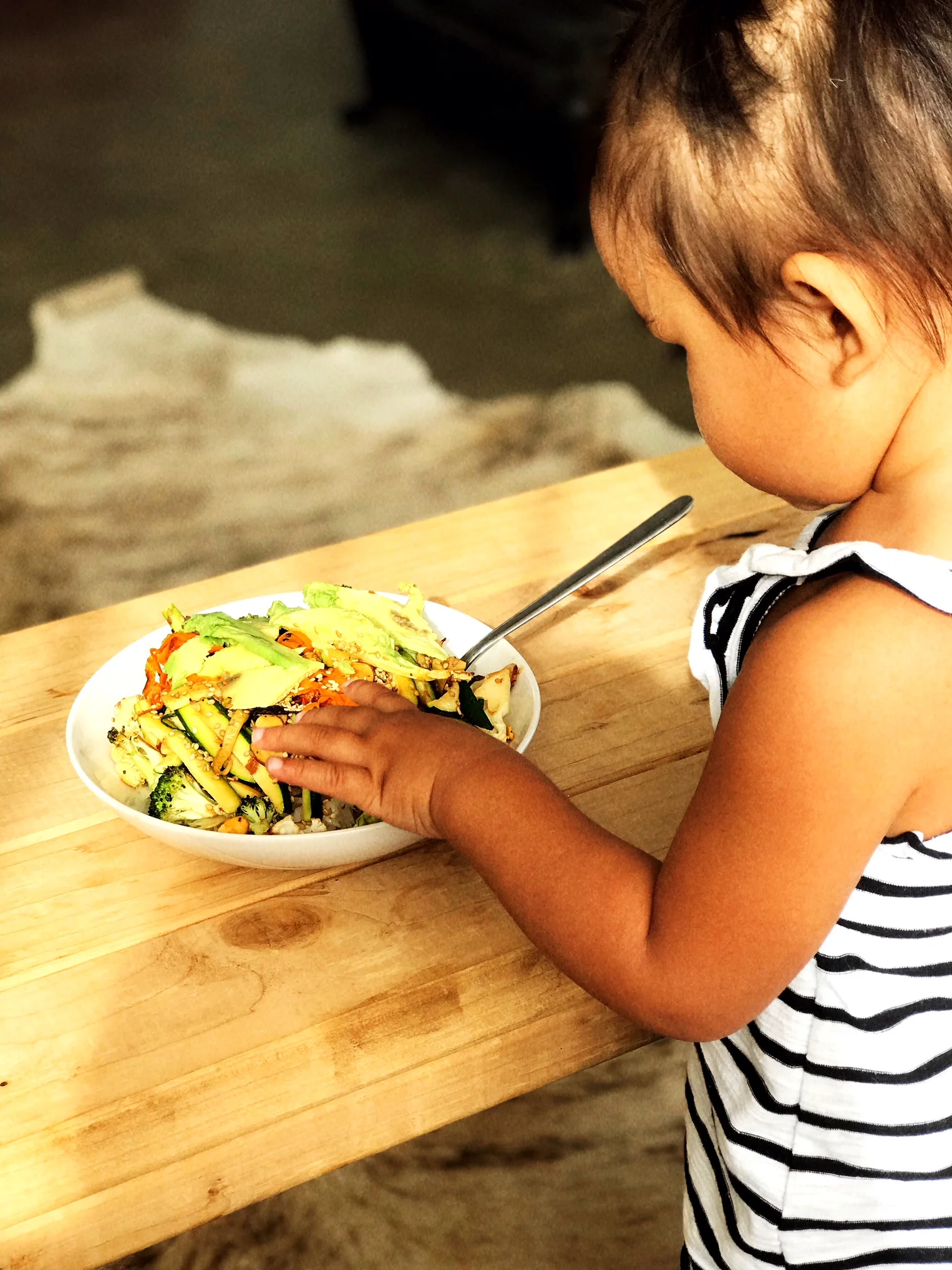 Once your veggies and rice are finished cooking add them to a bowl and top with some sunflower seeds, almonds, avocado, sesame seeds, and soy sauce. We will try new sauces from the grocery store to mix up the flavor from time to time. But generally, soy sauce taste great. Enjoy!